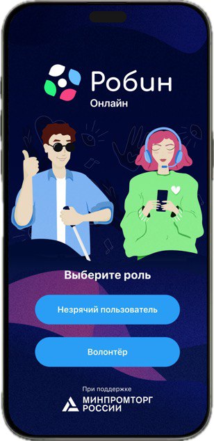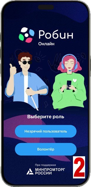 На экране появится текст с выбором роли: «Незрячий пользователь» или «Волонтёр». Для получения помощи выберите пункт «Незрячий пользователь».